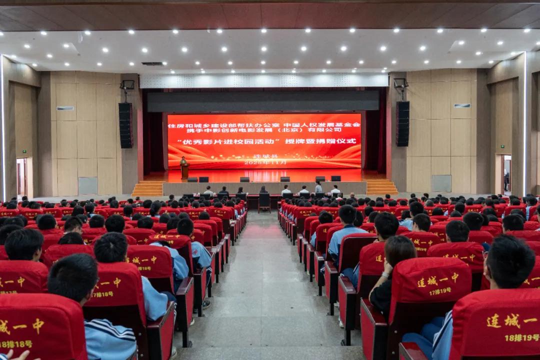 在連城一中“優(yōu)秀影片進(jìn)校園活動”中,全體師生觀看中影校園影視公益服務(wù)平臺視頻和電影《志愿軍》,并舉行電影設(shè)備捐贈授牌儀式,為連城一中、一中蓮北校區(qū)、二中授牌。賈會霞指出,作為中央宣傳部主管、致力于促進(jìn)人權(quán)事業(yè)發(fā)展的公益組織,中國人權(quán)發(fā)展基金會認(rèn)真貫徹落實(shí)習(xí)近平總書記關(guān)于尊重和保障人權(quán)的重要論述,依托“中影校園影視公益服務(wù)平臺”,策劃實(shí)施“優(yōu)秀影片進(jìn)校園”公益項(xiàng)目,旨在把優(yōu)質(zhì)文化資源精準(zhǔn)送達(dá)校園,幫助同學(xué)們健康成長。董紅梅強(qiáng)調(diào),紅色文化是革命老區(qū)最寶貴的精神財(cái)富,青少年是傳承紅色血脈、賡續(xù)紅色基因的核心力量。希望學(xué)校要以捐贈為契機(jī),創(chuàng)新紅色教育形式,打造“光影育人”特色品牌,讓紅色教育更具吸引力、感染力。同學(xué)們要以電影設(shè)備為橋梁,在經(jīng)典影片的藝術(shù)熏陶中觸摸歷史溫度,在革命故事的沉浸式體驗(yàn)中感悟初心使命,將紅色精神內(nèi)化為成長路上的精神滋養(yǎng)。她表示,住房城鄉(xiāng)建設(shè)部將持續(xù)把老區(qū)青少年成長、民生需求放在對口支援工作的重要位置,持續(xù)深化“親戚式”幫扶關(guān)系,以更實(shí)舉措、更優(yōu)服務(wù)助推革命老區(qū)蘇區(qū)在高質(zhì)量發(fā)展的道路上闊步前行,讓紅色土地?zé)òl(fā)新的時(shí)代生機(jī)。